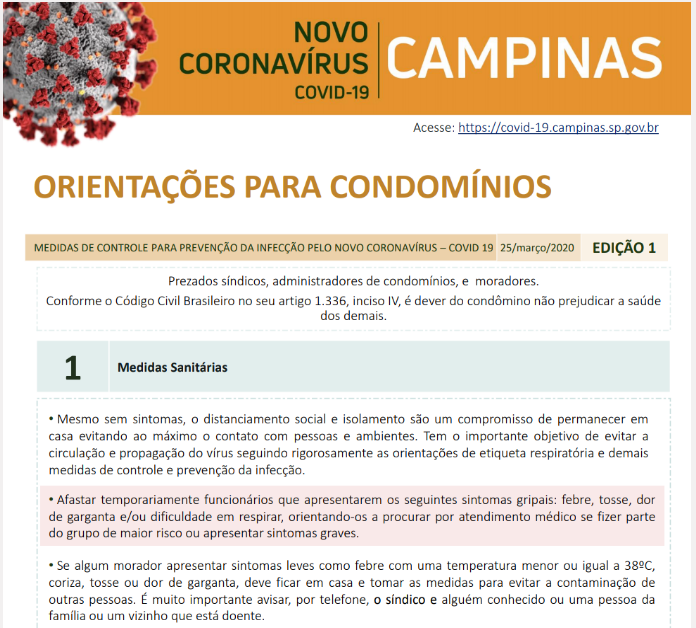 Confira as orientações e medidas protetivas para Condomínios sobre o novo coronavírus, emitido pelas autoridades sanitárias do municipio de Campínas